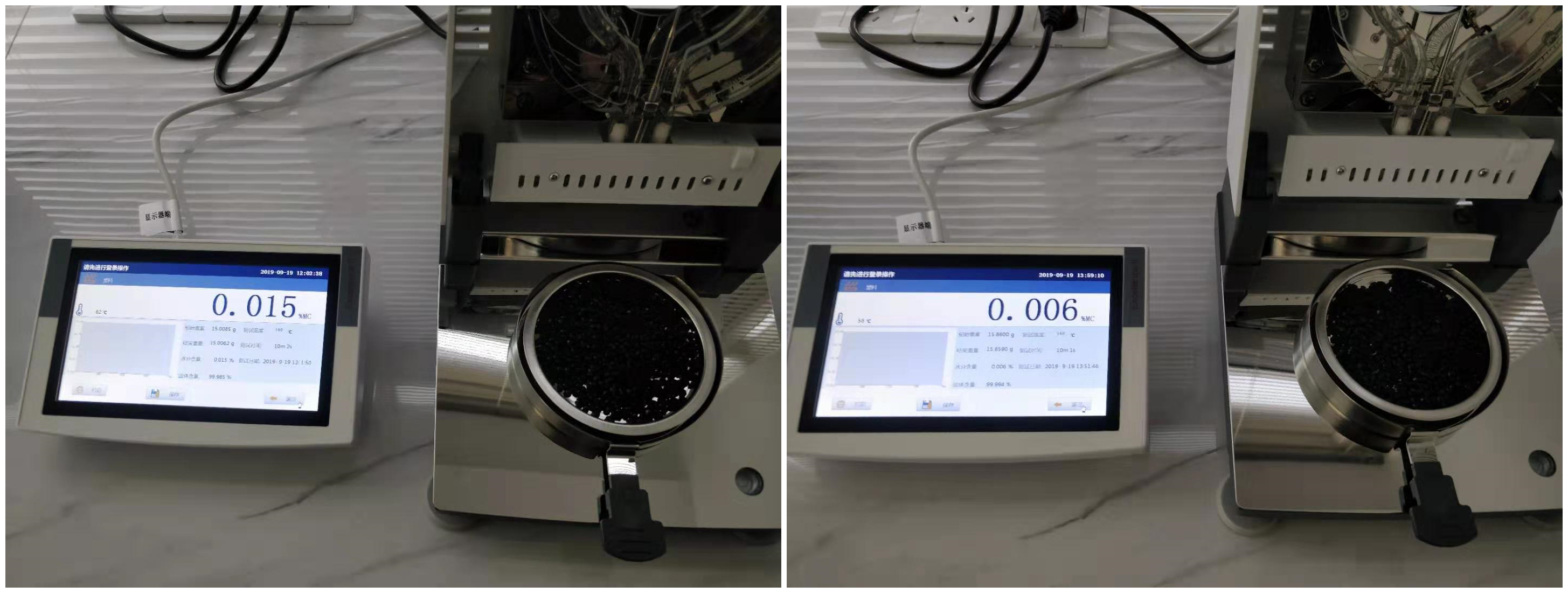- 停機(jī)以后為了避免烘干的塑料粒子吸收空氣中的水分,馬上再次啟動程序,時間到后儀器自動停機(jī),顯示烘干后塑料粒子的水分。