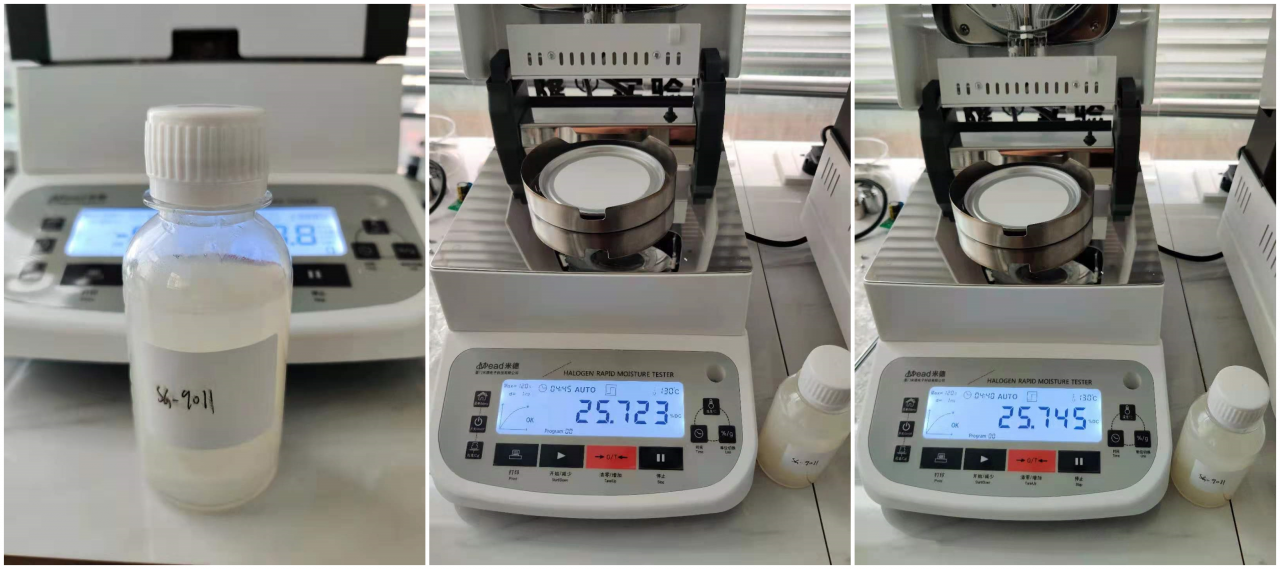 6、做完溶液1的重復(fù)性測試后,我們對溶液2進行同樣的操作,重復(fù)上述步驟,得出溶液2兩次測試的固含量結(jié)果為25.723%和25.745%,誤差為0.022%。